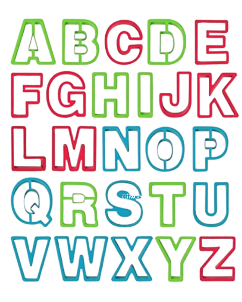 Cortador de letras, abecedario completo ideal para repostería, medida aproximada de cada letras largo 5cm, ancho 4,5 cm alto 1,4cm
