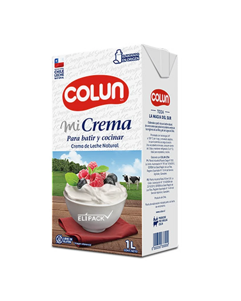 La Crema para batir UHT COLUN es obtenida a partir de leche fresca que es sometida a enfriamiento, pasteurización y estandarización de materia grasa antes del tratamiento UHT (Ultra High Temperature) a 138°C por 4 segundos y envasado aséptico, lo que le permite una larga duración. Esta crema al ser tratada y envasada en su lugar de origen, conserva sus características nutricionales y organolépticas.