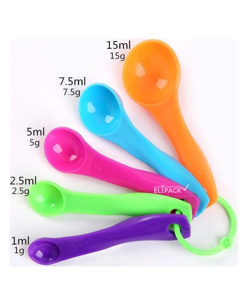 Cuchara medidora en ml y gramos, contiene 5 piezas y es un excelente utensilio en la cocina, sus medidas son de 1gr, 2,5gr, 5gr, 7,5gr, 15gr, en total tiene un largo de 13 cm y 3cm de ancho.