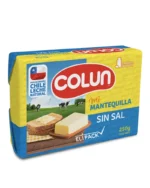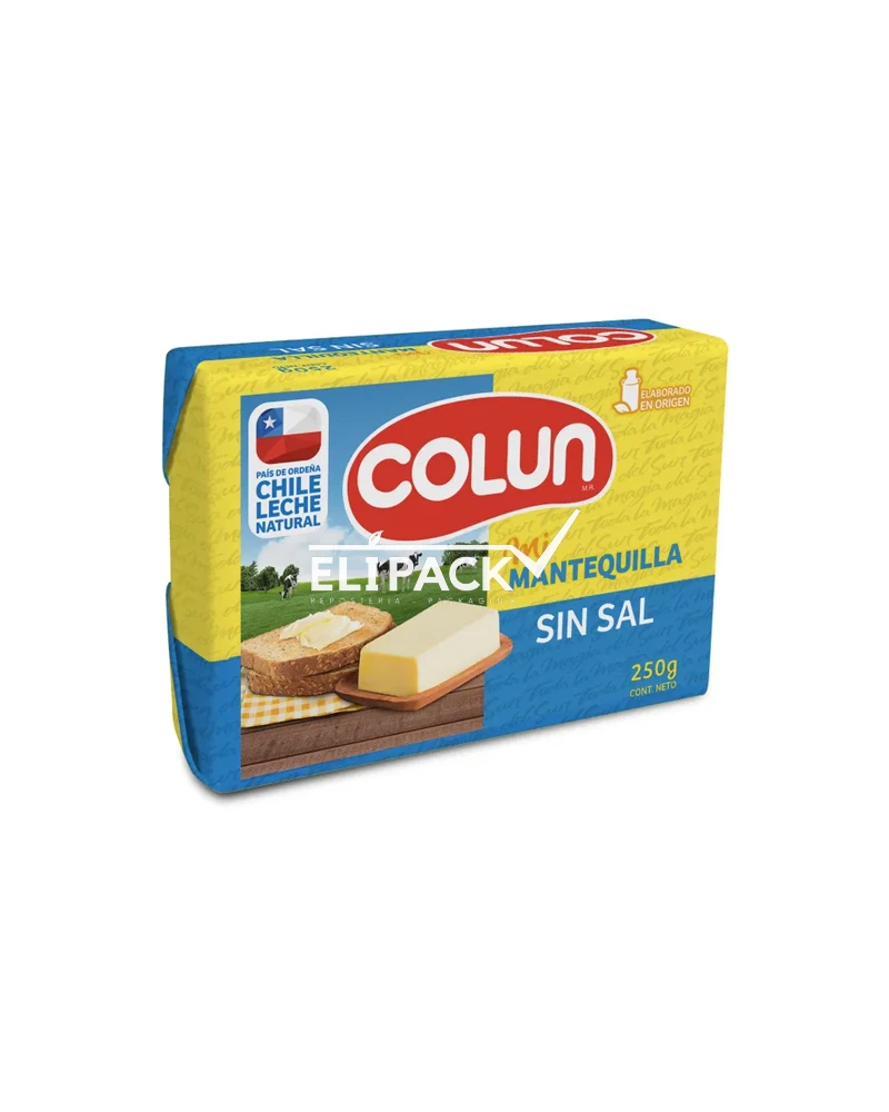 Mantequilla panificada Colun es un producto lácteo derivado exclusivamente de crema fresca pasteurizada de leche. Sus propiedades organolépticas son: color amarillo suave, sabor y aroma característico y buena untabilidad.