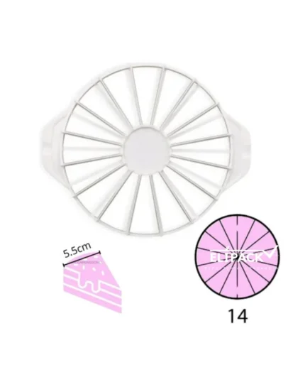 Cortador/ porcionador de tortas, tartaletas y cheesecake, utensilio repostero que facilita la precisión en los cortes de tus preparaciones, generando 14 porciones por un lado y por el reverso 16 porciones, dando la posibilidad de generar un trabajo prolijo.